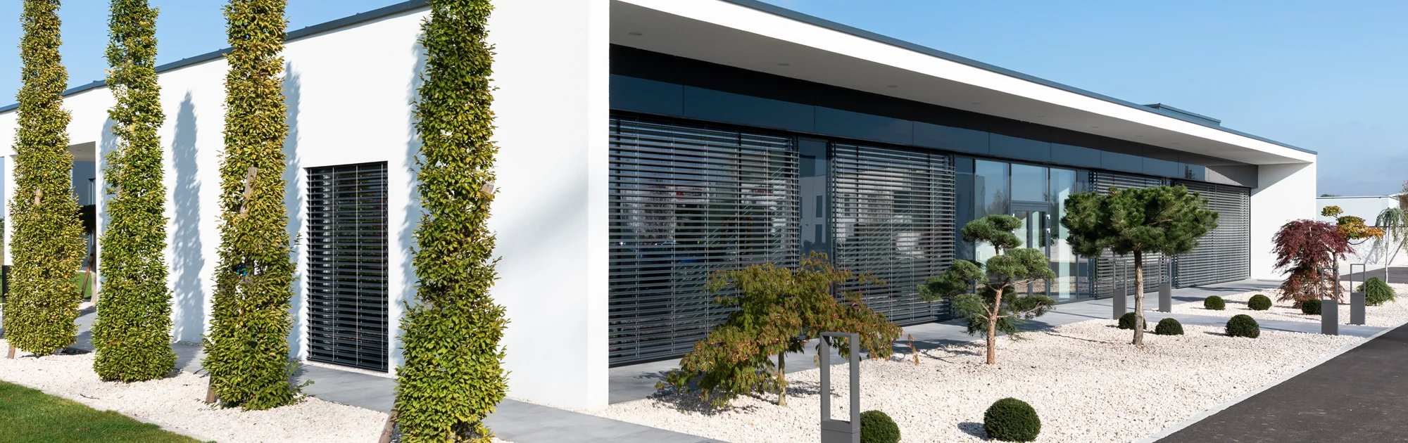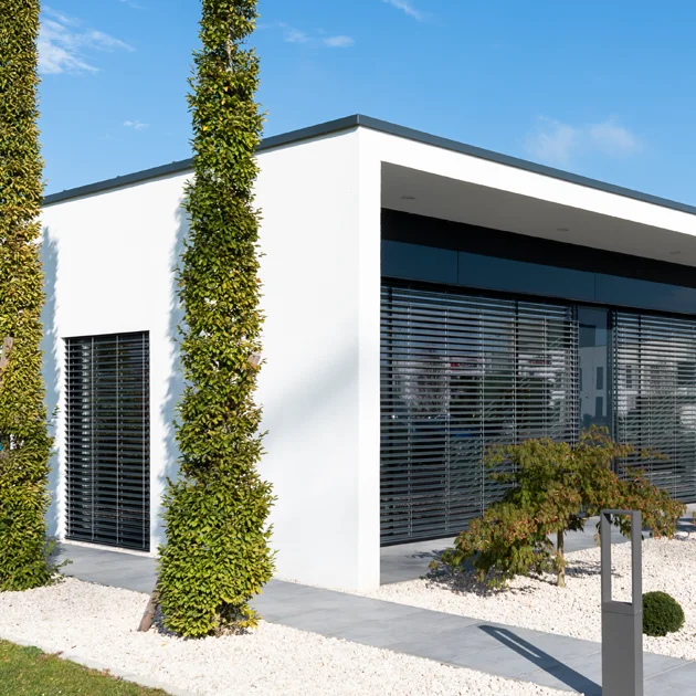 Modernes Haus mit Raffstores als außenliegende Sonnenschutz-Lösung